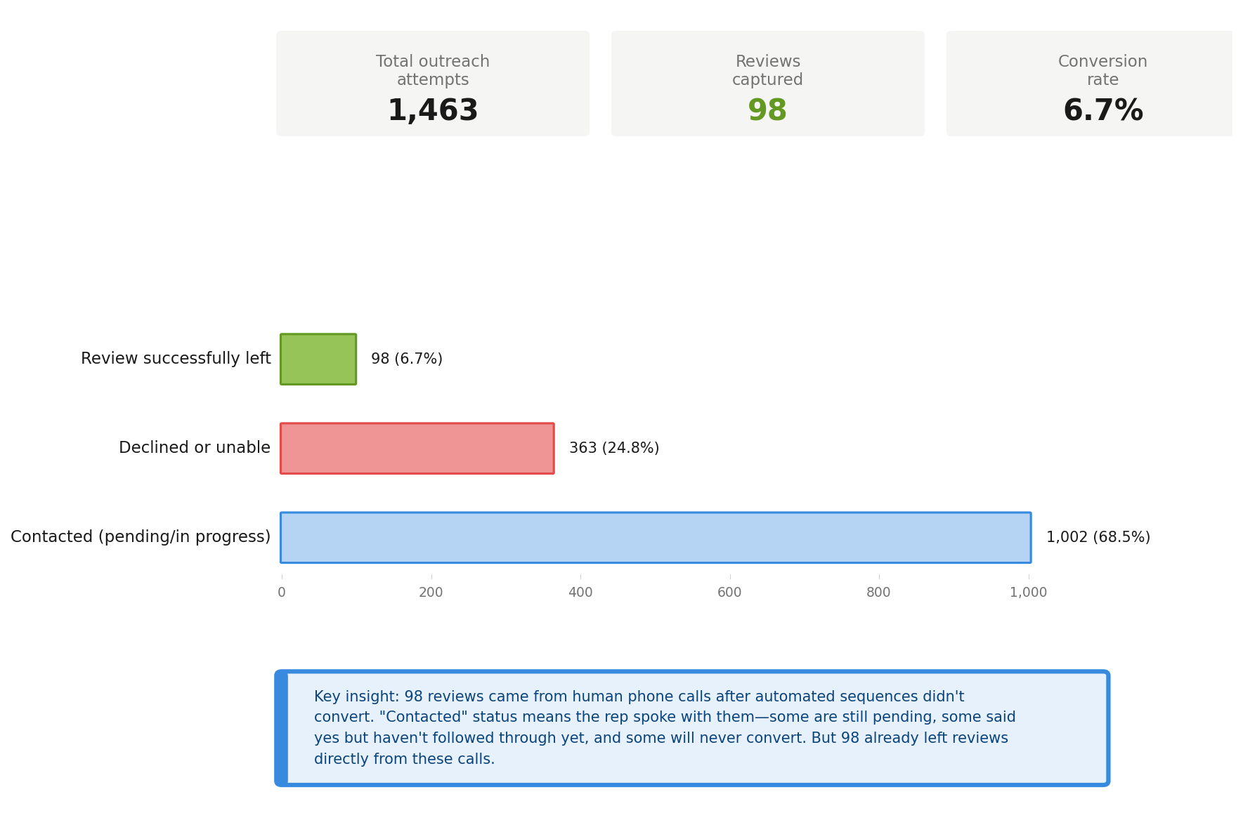 Out of 1,463 human outreach attempts, 98 reviews came directly from phone calls—clients who didn't respond to SMS or email but said yes when a real person called them.