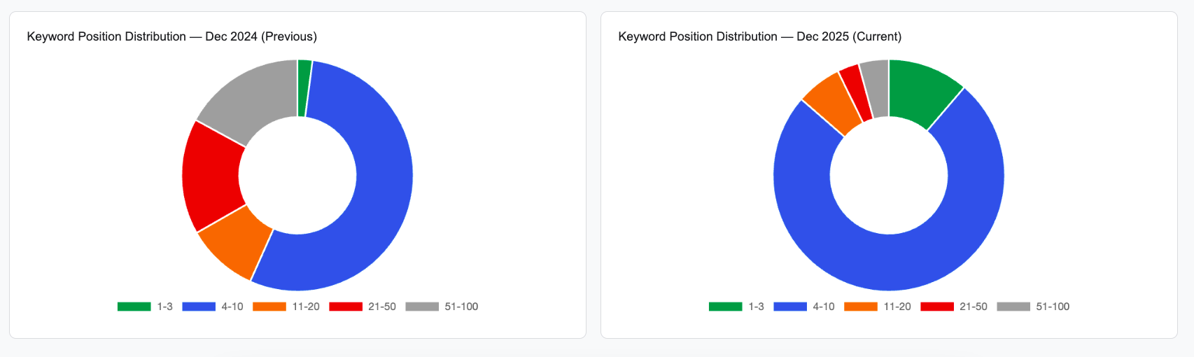 These pie charts show the complete picture. We didn't just add keywords—we repositioned the entire keyword portfolio toward money positions.